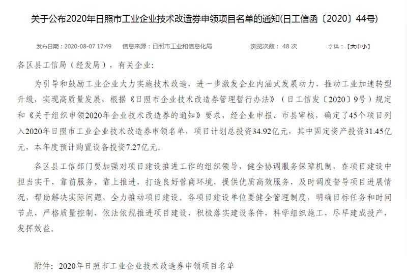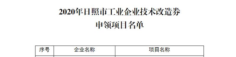 我公司成功申領(lǐng)2020年日照市工業(yè)企業(yè)技術(shù)改造券