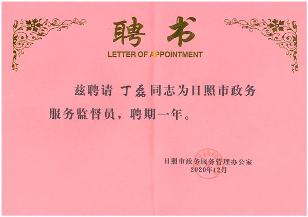 2020年12月3日,日照市政府服務管理辦公室、日照市行政審批服務局舉行日照市政務服務監(jiān)督員聘任儀式及政府開放日活動,公司董事、行政總監(jiān)丁磊被聘為日照市政務服務監(jiān)督員。